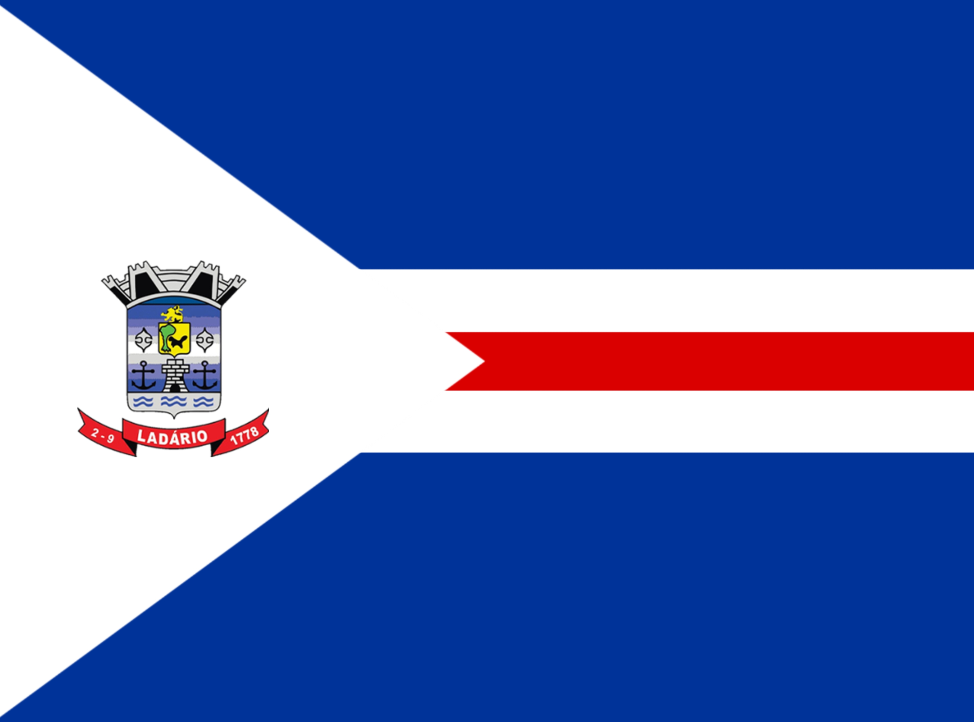 Escudo samnítico encimado pela coroa mural de seis torres, de argente. Em campo de Bláu, posto em abismo, um escudete de jalde com um leão de sable passante ao pé de um pineiro de sínopla com raízes de argente e timbrado de meio leão de jalde. Acontonadas em chefe duas flores-de-lis de argente. Ao termo, um aguado de argente ondulado de bláu, nascente do qual o laço de muralha com três baluartes, ladeado de duas âncoras, tudo de argente. Nos ornamentos exteriores, um listel de goles, contendo em letras argentinas o topônimo “Ladário” ladeado pela data “2-9-1778”.