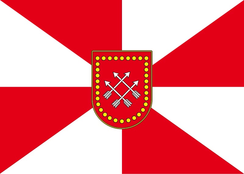 A Bandeira Municipal possui em seu desenho, os seguintes significados: Os triângulo-retângulos de fundo, alternados entre vermelho e branco, consistem nas cores das armas do município (vermelho), da prata (branco) e do ouro (amarelo), que são usadas ao centro com o Brasão, formando quatro linhas retas que se cruzam ao centro e duas na diagonal. O brasão se ostenta sem seus ornamentos, restando apenas o escudo, e é circundado por uma borda amarela.